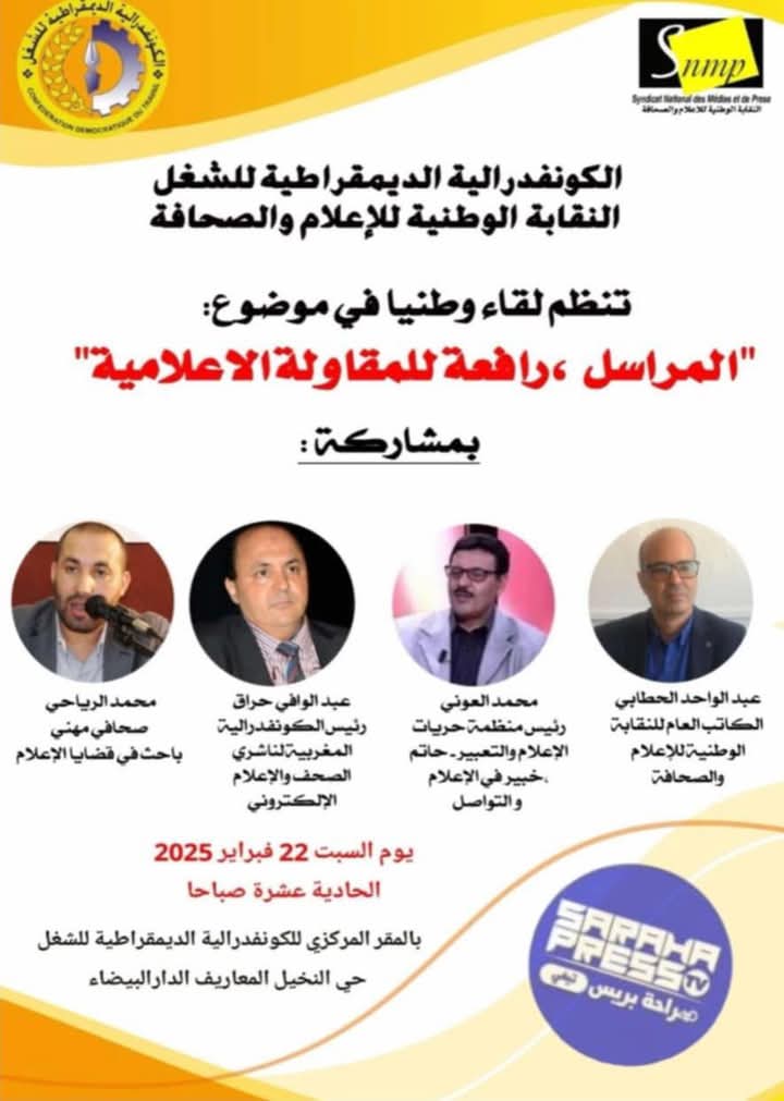 Ýí ÅØÇÑ ÊÚÒíÒ ÏæÑ ÇáÕÍÇÝÉ æÊÞæíÉ ãßÇäÉ ÇáãÑÇÓáíä ÏÇÎá ÇáãÔåÏ ÇáÅÚáÇãí ãÍáíÇ ææØäíÇ¡ ÊäÙã ÇáßæäÝÏÑÇáíÉ ÇáÏíãÞÑÇØíÉ ááÔÛá – ÇáäÞÇÈÉ ÇáæØäíÉ ááÅÚáÇã æÇáÕÍÇÝÉ áÞÇÁð æØäíÇð ÊÍÊ ÚäæÇä “ÇáãÑÇÓá¡ ÑÇÝÚÉ ááãÞÇæáÉ ÇáÅÚáÇãíÉ”¡ æÐáß íæã ÇáÓÈÊ 22 ÝÈÑÇíÑ 2025 Úáì ÇáÓÇÚÉ ÇáÍÇÏíÉ ÚÔÑÉ ÕÈÇÍÇð¡ ÈÇáãÞÑ ÇáãÑßÒí ááßæäÝÏÑÇáíÉ ÇáÏíãÞÑÇØíÉ ááÔÛá¡ Íí ÇáäÎíá Ü ÇáãÚÇÑíÝ Ü ÇáÏÇÑ ÇáÈíÖÇÁ.