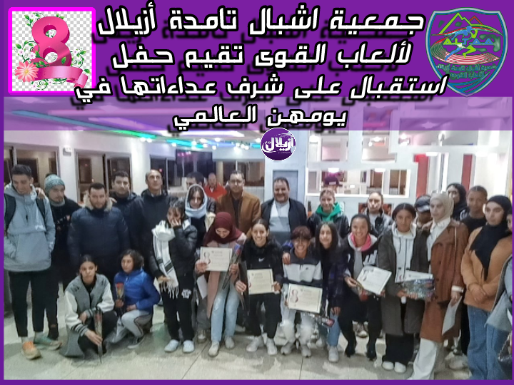تخليدا لليوم العالمي للمرأة الذي يصادف 8 مارس من كل سنة ، نظم المكتب المسير لجمعية تامدة أزيلال لألعاب القوى ، مساء اليوم الجمعة 8 مارس ، حفل استقبال على شرف عداءات النادي ، تم خلاله توزيع الورود وشواهد تقديرية عربون محبة وتقدير وعرفاناً رفانا بمجهوداتهن المبذولة والنتائج المشر...