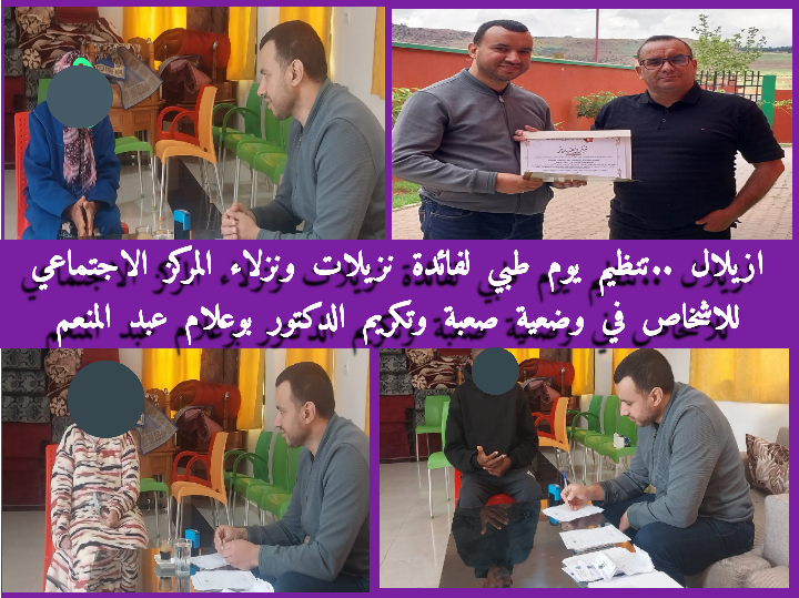 ازيلال ..تنظيم يوم طبي لفائدة نزيلات ونزلاء المركز الاجتماعي للاشخاص في وضعية صعبة وتكريم الدكتور بوعلام عبد المنعم بمناسبة انتقاله