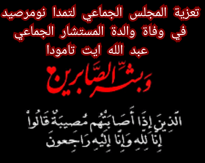 وبهذه المناسبة الأليمة يأبى رئيس المجلس الجماعي ، لحسن ايت اصحا ، أصالة عن نفسه ونيابة عن باقي أعضاء المجلس الجماعي ، إلا أن يتقدم بأحر التعازي والمواساة إلى للمستشار عبد الله ايت تامودا و من خلاله إلى باقي أفراد عائلته ، راجين من العلي القدير أن يتغمد الفقيدة بواسع رحمته، وأن يجعل مثواها الجنة مع النبيين والصديقين والشهداء والصالحين، وحسن اولئك رفيقا ، و بان يهم اهلها وذويها اجمعين جميل الصبر وحسن العزاء .