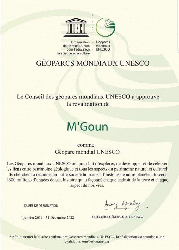 حضي المنتزه الجيولوجي مكون ، بإعتراف منظمة اليونسكو كثرات عالمي للفترة الممتدة ما بين 2019و2022 ، كتتويج ثاني،الذي جاء كثمرة مجهودات فريق العمل التقني والعلمي للمنتزه ،لثلاثة سنوات من العمل الجاد والدؤوب ،لضمان الاستجابة لكل الشروط المنصوص عليها بدفتر التحملات المسطر من طرف الشبكة العالمية للمنتزهات الجيولوجية التابعة لمنظمة اليونسكو،بحيث يعتبر منتزه مكون، الوحيد على الصعيد الإفريقي والعربي الذي حضي بهذا التتويج العالمي. تجدر الإشارة ،الى أن منتزه جيوبارك مكون ،يمتد على مساحة تقدر ب 5700 كلم مربع ،ويضم 15جماعة ترابية 13 منها بإقليم ازيلال و جماعتين بإقليم بني ملال، وهو غني بمواقعه الإيكولوجية و ثراته الثقافي والمعماري ،و تنوعه البيولوجي؛ كما يضم مجموعة من المواقع المتميزة،من بينها بحيرة بين الويدان ،شلالات اوزود،القنطرة الطبيعية إمي نفري بدمنات، خوانق تاغيا ،كاتدرائية مستفران بإمي نوارك وزاوية احنصال والهضبة السعيدة لايت بوكماز ،المنحوتات الصخرية بتزي نترغيست، آثار الديناصورات بإيواريدن وإباقلاون هذا علاوة على ما تتميز به المنطقة من امكانيات هائلة لممارسة الرياضات الجبلية و السياحة الإيكولوجية و المستدامة. وتأهيل المواقع السياحية بمنتزه جيوبارك مكون، عمل مجلس جهة بني ملال خنيفرة ،بشراكة مع المجلس الإقليمي لازيلال ومجموعة الجماعات الاطلسين الكبير والمتوسط ،على فتح العديد من المسالك الجبلية ،ودعم الجمعيات المحلية ،وعقد شراكات لتأهيل القطاع التعاوني ودعم المنتجات المجالية،كما تم إحداث متحف جيولوجي بأزيلال،فيما الاشغال جارية من أجل إعداد منتزه دينوبارك بأوزود . و قد تزامن هذا التتويج مع مصادقة الاتحاد الأوربي على مشروع شراكة مع مجلس الجهة لتمويل مشروع دعم التعاونيات لإنتاج الأجبان بمجال المنتزه ،على أن تستمر جهود الجهة لتأهيل باقي الفضاءات ومواكبة أرباب المآوي الجبلية وإعادة فتح مركز تابانت لتكوين المرشدين السياحيين في المهن الجبلية ،اضافة الى تعزيز آليات الإرشاد والتوجيه السياحي من خلال تفعيل دار الجبل واحدات منصة لتتمين المنتجات المجالية،خاصة الزعفران والعسل والجوز وزيت الزيتون والاجبان، وجعلها في مستوى الاعتراف العالمي بمنتزه جيوبارك كثرات إنساني عالمي.