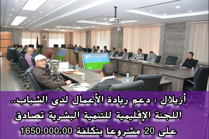 في اطار تفعيل برامج المبادرة الوطنية للتنمية البشرية برسم الفترة الثالثة 2019-2023 ،وخصوصا السنة المالية 2023 ، انعقد بمقر الكتابة العامة لإقليم ازيلال يوم الخميس 8 يونيو 2023، اجتماع اللجنة الاقليمية للتنمية البشرية تحت رئاسة السيد عبد اللطيف حلويت، الكاتب العام للإقليم ،وبحضور اعضاء اللجنة الاقليمية ،خصص للدراسة والمصادقة على 20 مشروعا المقترحة في اطار البرنامج الثالث للمبادرة الوطنية للتنمية البشرية محور دعم ريادة الاعمال لدى الشباب برسم سنة 2023 بكلفة اجمالية بلغت 1650.000.00 درهم ،ساهم خلالها صندوق المبادرة الوطنية للتنمية البشرية بمبلغ 1.500.000.00 درهم همت القطاعات التالية :
