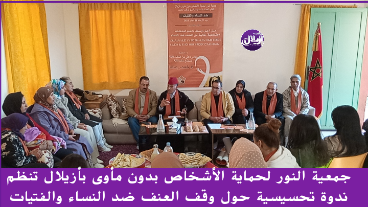 في إطار الحملة الأممية والوطنية ال 22 لوقف العنف ضد النساء والفتيات ، نظمت جمعية النور لحماية الأشخاص بدون مأوى بأزيلال، يوم الأربعاء 18 دجنبر ، ندوة تحسيسية تناقش وقف العنف ضد النساء والفتيات ، بمركز الأمل للأشخاص في وضعية صعبة بأزيلال، وذلك بشراكة مع وزارة التضامن والإدماج الاجتماعي والأسرة، والمندوبية الإقليمية للتعاون الوطني بازيلال .