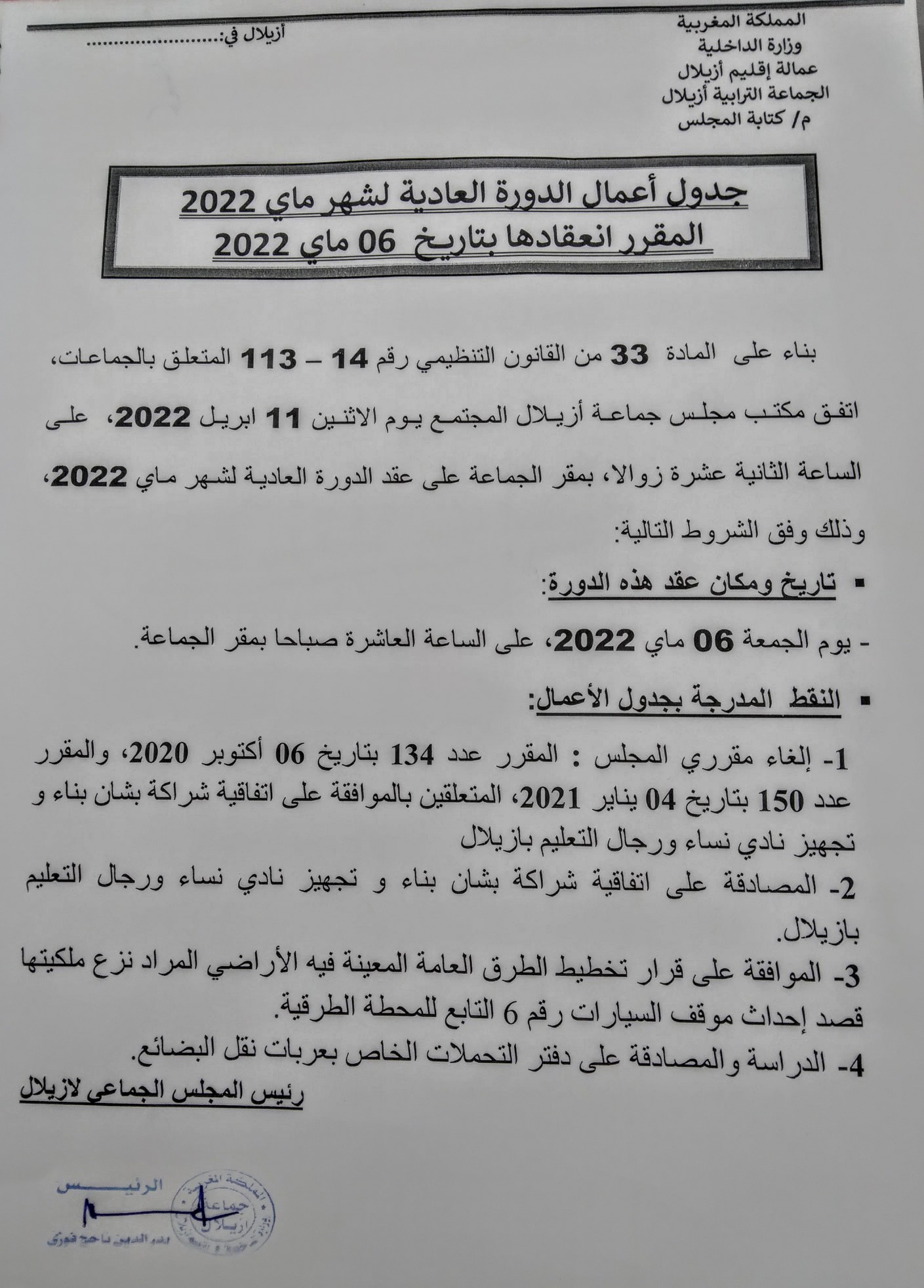 مقرر عدد 134 بتاريخ: 06 اکتوبر 2020 ،و مقرر عدد 150 بتاريخ: 04 يناير 2021 ، المتعلقين بالموافقة على اتفاقية شراكة بشأن بناء وتجهييز نادي نساء ورجال التعليم بأزيلال.