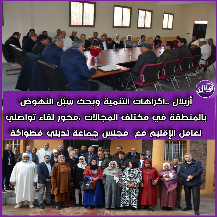 ترأس عامل إقليم أزيلال،السيد محمد عطفاوي صباح اليوم الجمعة 16 دجنبر ، لقاء تواصليا مع أعضاء المجلس الجماعي لتيدلي فطواكة ، تمحور حول الانصات الى اهم المشاكل والاكراهات التي تعيق التنمية والبحث عن السبل الكفيلة بالنهوض بالجماعة و استكمال تأهيلها في مختلف المجالات .