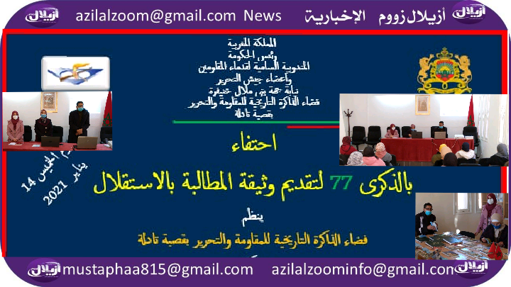 وتناولت الأستاذة صفاء الانصاري ،الإطار بفضاء الذاكرة التاريخية للمقاومة والتحرير بقصبة تادلة ، في مداخلتها، أهم مضامين كتاب تراجم الموقعين على وثيقة المطالبة بالاستقلال، حيث أشارت إلى كون عددهم بلغ 66 شخصا كان من بينهم امرأة واحدة هي السيدة لالة مليكة الفاسي، كما تحدثت عن انتمائهم الاجتماعي والجغرافي، بالإضافة إلى الحديث عن أبرز مضامين الوثيقة ذاتها.