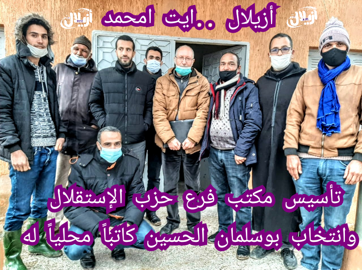 في أجواء تتماشى والإجراءات الاحترازية المعمول بها للحد من تفشي فيروس كورونا المستجد " كوفيد_19 " ، عقدت المفتشية الإقليمية لحزب الاستقلال بإقليم أزيلال ،يوم السبت 27 فبراير 2021 ، بمقر دار الشباب بجماعة ايت امحمد ، اجتماعا لتأسيس فرع الحزب بالجماعة ، وذلك بحضور المفتش الإقليمي للحزب ومناضلي الحزب .