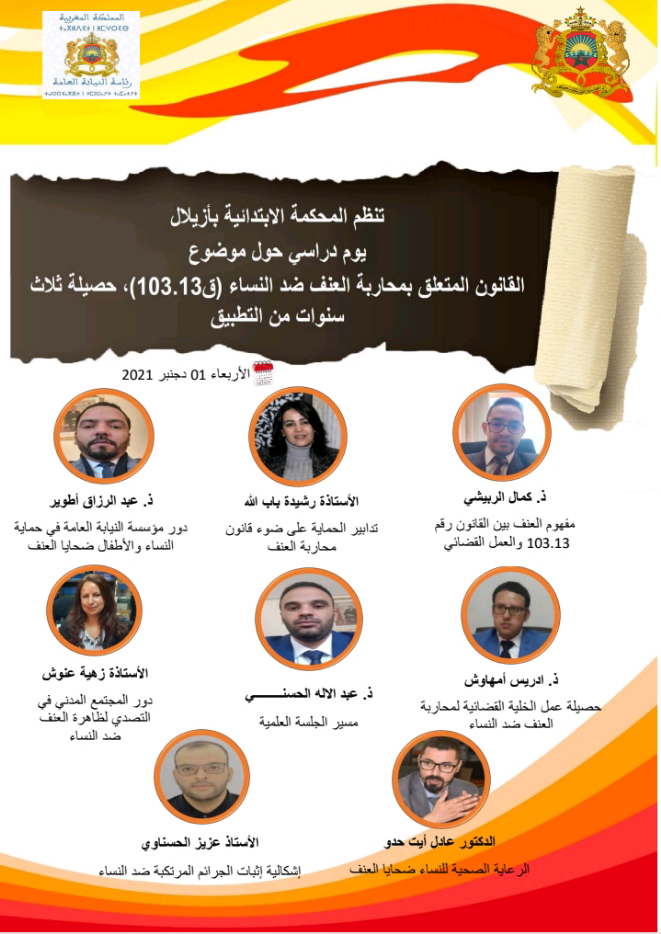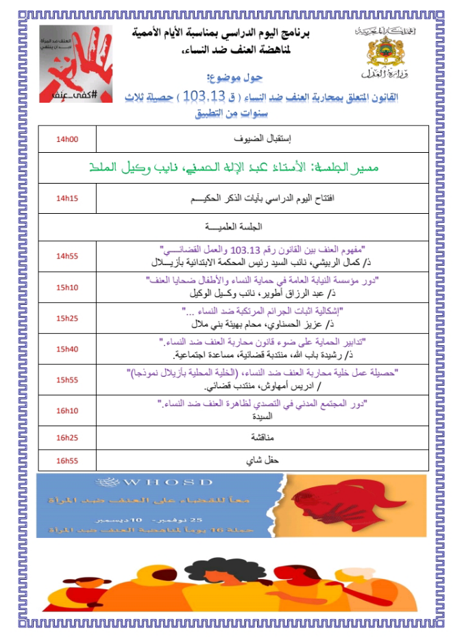 في اطار الحملة الوطنية لمناهضة العنف ضد النساء، الممتدة في الفترة مابين 25 نونبر الجاري و 10دجنبر المقبل تحت شعار " انخرط " تنظم المحكمة الإبتدائية بأزيلال زوال يوم غد الأربعاء فاتح دجنبر 2021، ابتداء من الساعة الثانية بعد الزوال ، يوما دراسيا حول موضوع " القانون المتعلق لمحاربة العنف ضد النساء (103.13)، حصيلة ثلاث سنوات من التطبيق" .