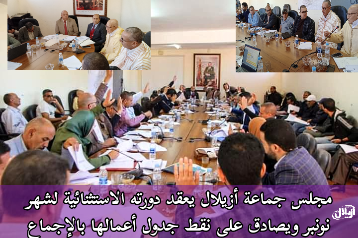 صادق المجلس الجماعي لأزيلال ، بالإجماع على النقط المدرجة بجدول أعمال دورته الاستثنائية ،المنعقدة يوم الجمعة 4 نونبر ،برآسة السيد بدر الدين ناجح فوزي ، رئيس المجلس الجماعي لأزيلال، وبحضور باشا المدينة و اعضاء المجلس الى جانب عدد من موظفات وموظفي واطر المجلس الجماعي وباشوية أزيلال .