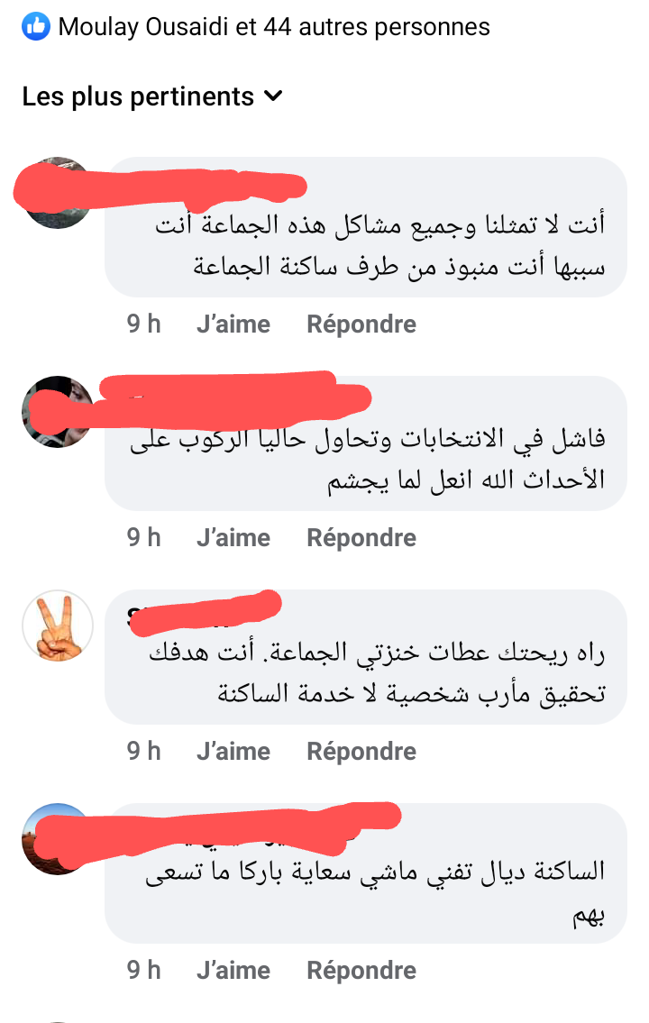 الى ذلك ، ومن خلال تعاليق رواد الفايسبوك على الفيديو ، اتضح جليا ان هذا الشخص منبوذ من طرف هؤلاء وعموم ساكنة الجماعة ، وتمحورت الردود في مجملها حول فشله في الانتخابات ورغبته فقط في الركوب على الأحداث واتخاذ من موضوع المساعدات مطية لبلوغ أغراضه السياسية ولو بتمرير المغالطات ، على حد تعبيرهم ...