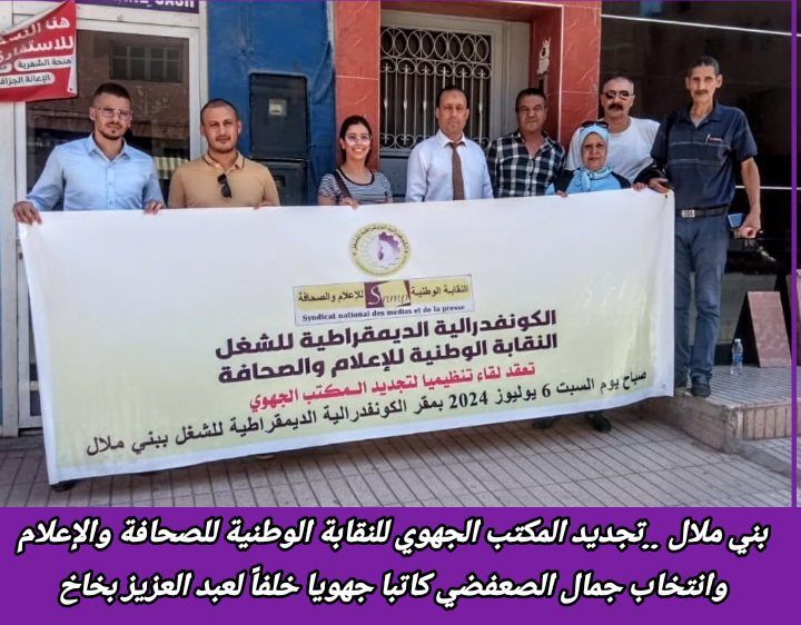 احتضن مقر المكتب الاقليمي للكونفدرالية الديمقراطية للشغل ببني ملال ، صباح اليوم السبت 6 يوليوز ، أشغال الجمع العام لتجديد اعضاء المكتب الجهوي للنقابة الوطنية للصحافة والإعلام ،المنضوية تحت لواء الكونفدرالية الديمقراطية للشغل ، والذي خلص الى انتخاب جمال الصعفضي كاتبا جهويا بإجماع الحضور، خلفا لعبد العزيز بخاخ .